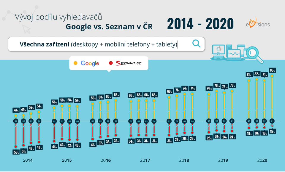 Po roce jsme opět zpracovali infografiku mapující podíl vyhledávačů Google a Seznam na českém internetu. Jak si na začátku roku 2021 vede český fenomén Seznam? Pokračuje pozvolný pokles jeho podílu vyhledávání? To vše se dozvíte v naší infografice.