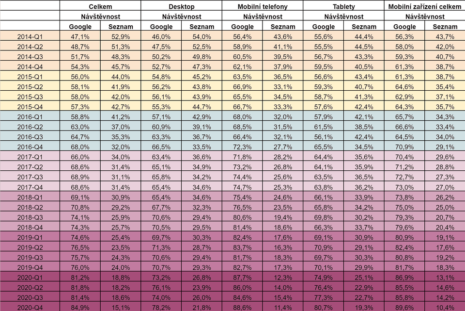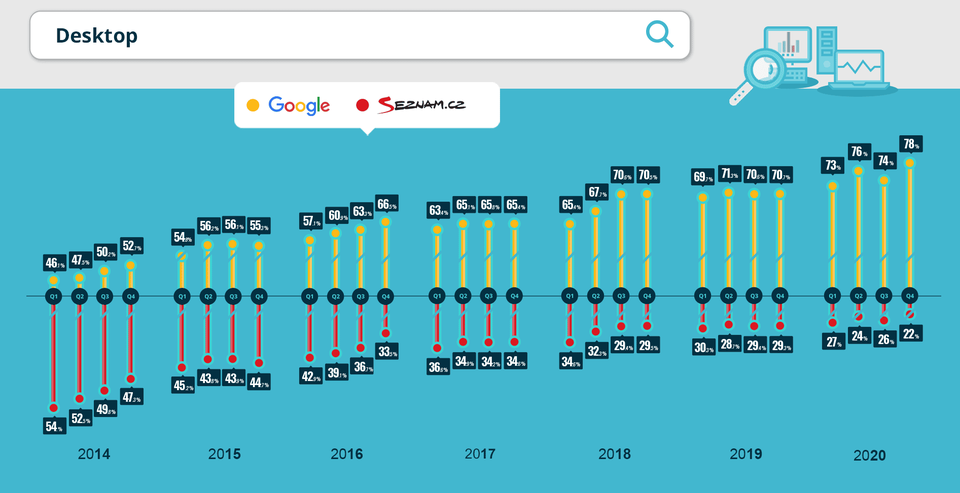 Podle námi zpracovaných dat Seznam držel většinový podíl na českém internetu až do roku 2014, což je vzhledem k tomu, že Google přišel do ČR už v roce 2006, obdivuhodná doba. Česká republika se spolu s několika málo zeměmi stala raritou, když v ní lokální vyhledávač delší časové období odolával dravé štice jménem Google.