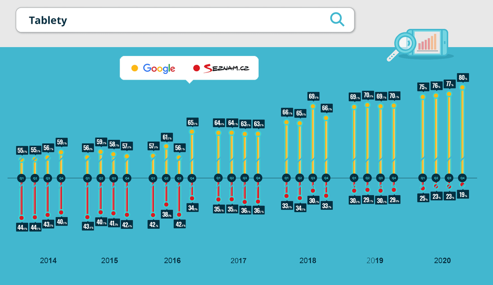Návštěvnost z tabletů hraje ve prospěch Googlu, a to v procentuálním poměru 80 : 20. I v tomto případě sledujeme soustavný růst podílu Googlu. Mezi sledovanými vzorky je podíl tabletů však pouze 4%.