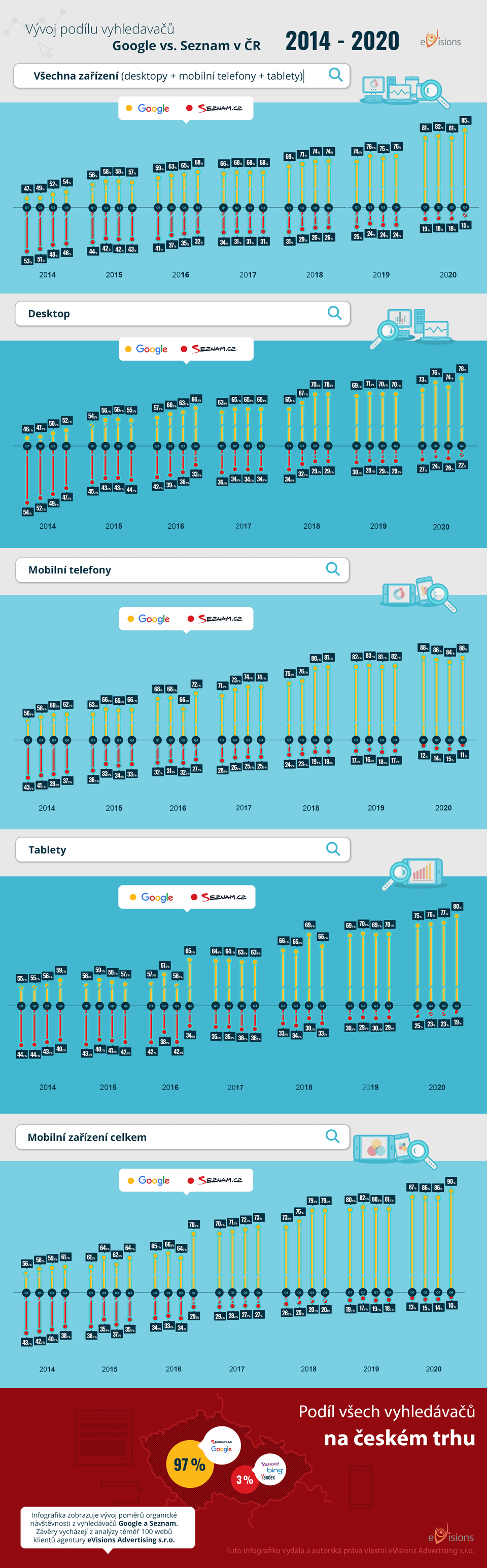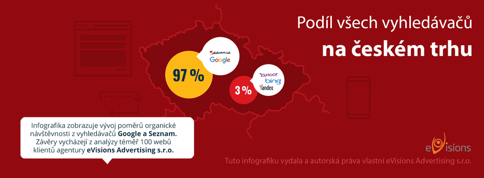 Před samotnou interpretací výsledků je nutno zmínit, že drobný podíl na trhu mají i další vyhledávače – Bing, Yandex a Yahoo, a to dohromady 3 %. V našich přehledech na ně nebudeme dále brát zřetel a budeme porovnávat pouze Google a Seznam.