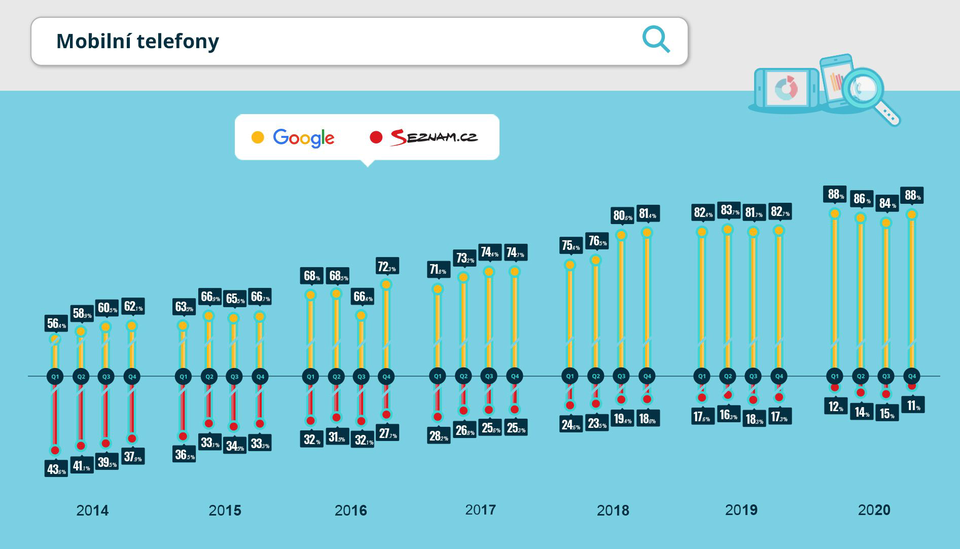 Google je z hlediska optimalizace vyhledávače pro mobilní vyhledávání silným hráčem. Neustále vylepšuje mobilní hledání, což mimochodem letos v březnu završí tzv. mobile first indexem, který bude zohledňovat ve výsledcích vyhledávání jen mobilní responzivní weby. Google v naší infografice dlouhodobě dosahuje nejsilnějšího podílu. Za rok 2020 si polepšil o 6 % a dosahuje více než 88% podílu.