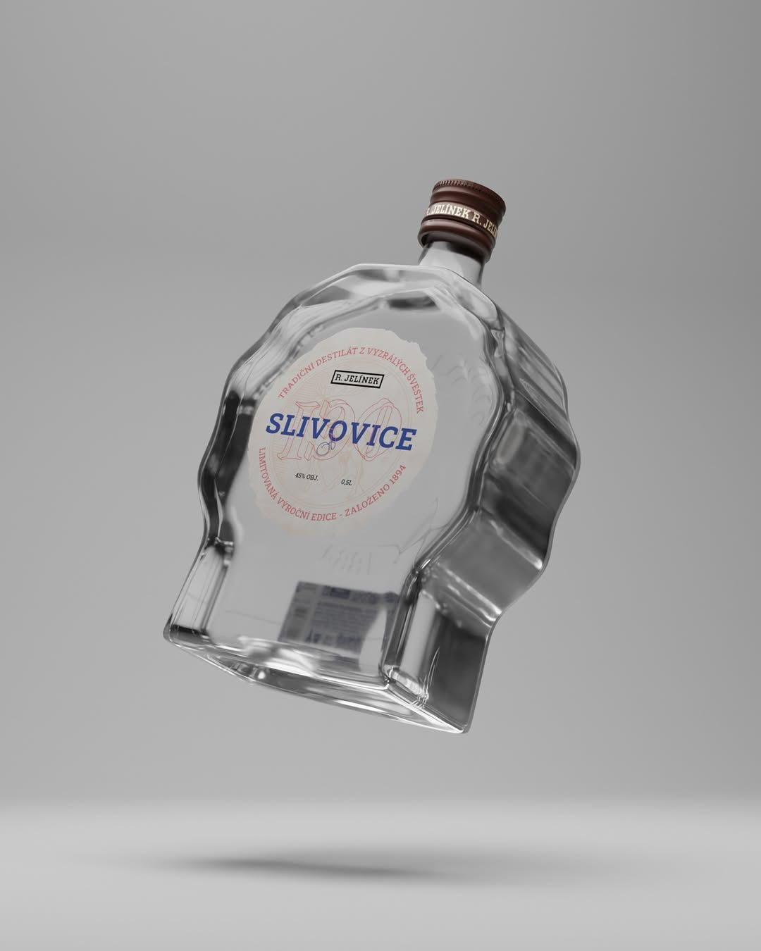 Ukázka našeho 3D designu pro limitovanou edici Slivovice R. Jelínek. Detailní vizualizace láhve zvýrazňuje prémiový charakter produktu a umožňuje prezentaci v realistickém prostředí ještě před samotnou výrobou.