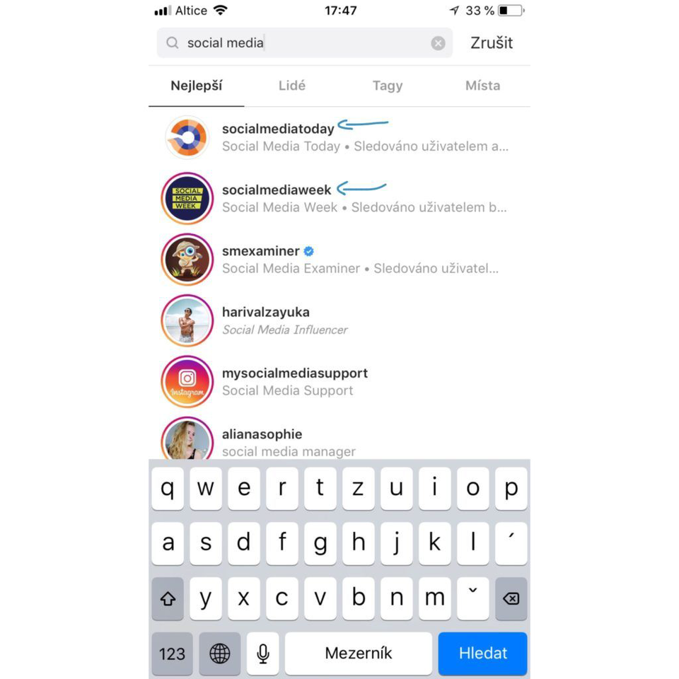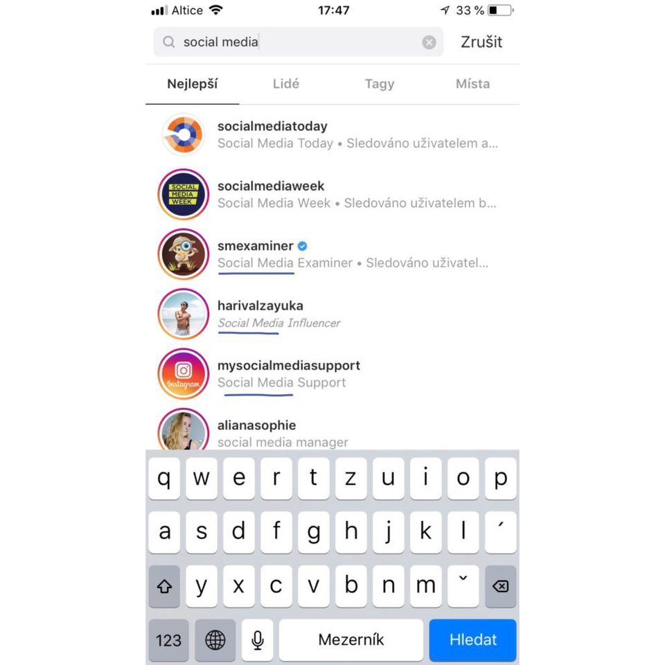 Pokud se vrátíme k původnímu příkladu, tedy vyhledáváme na Instagramu frázi social media, pak můžete na fotce níže vidět, jaké další profily by vám „vyjely“ (všimněte si tmavě modrého podtržení).