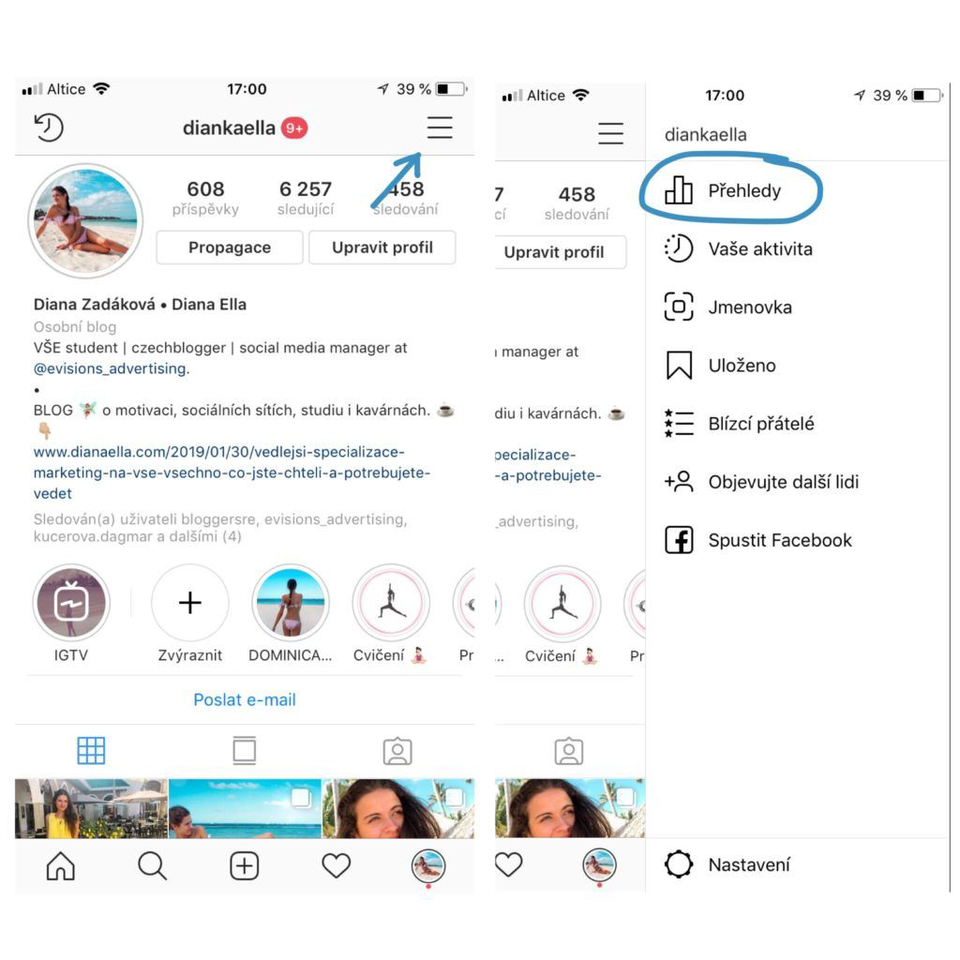 Analytická data (v Instagramu je najdete pod názvem přehledy) získáte pouze, pokud budete mít svůj profil v režimu business profile. Přehledy vašeho profilu najdete na Instagramu dle návodu na fotce.