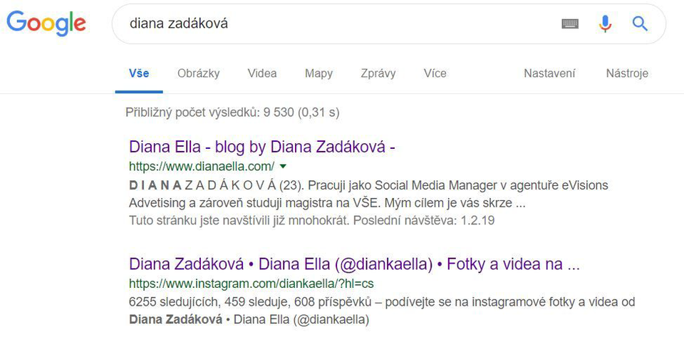 Například mé instagramové jméno je „Diana Zadáková • Diana Ella“. Pokud by mě někdo hledal podle názvu mého blogu či mého celého jména, „vyjede“ mu právě můj profil.