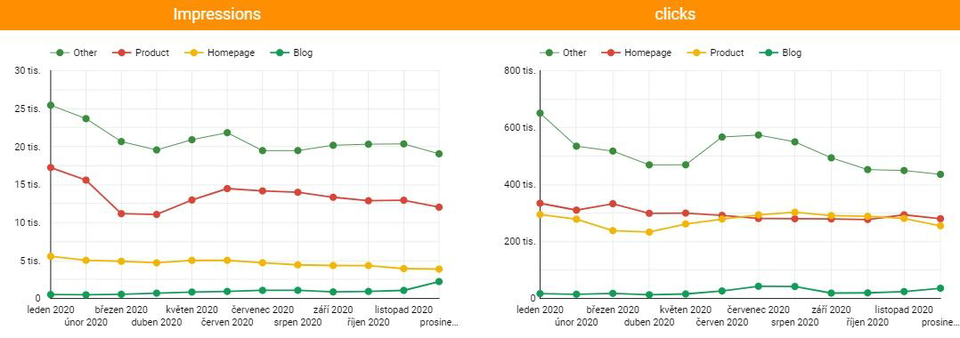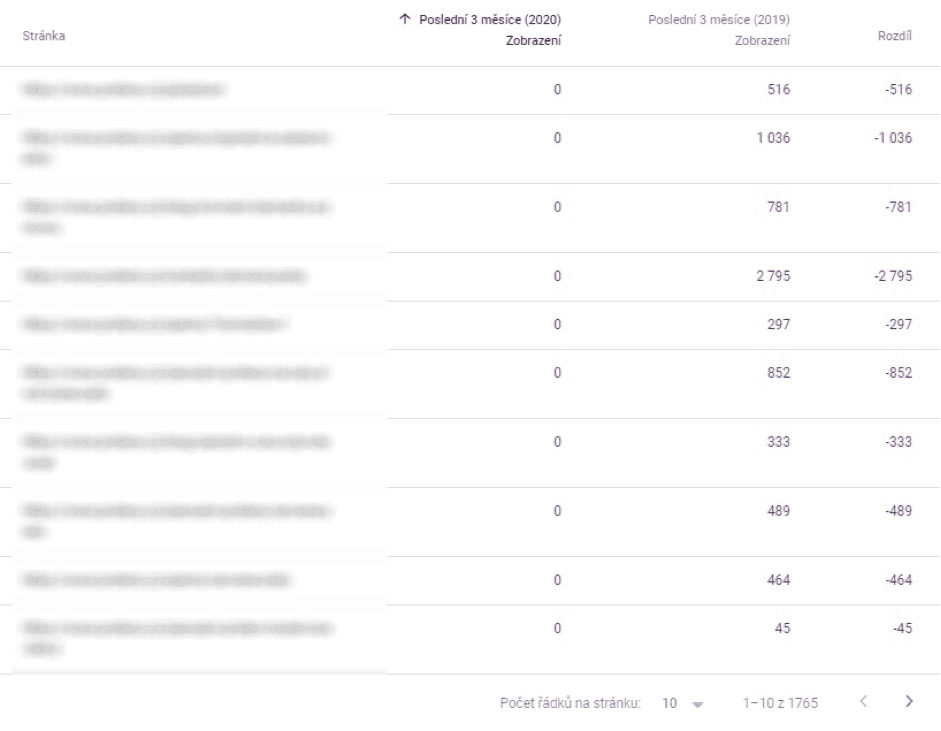 Pokud analyzujete stránky při analýze návštěvnosti a porovnáváte nějaké období, a to jak meziroční, tak předchozí, a máte zapnuté pouze imprese a koukáte se na URL, které vám poklesly, tak je dobré se zaměřit na ty, kde v aktuálním období uvidíte 0, tedy žádné imprese. To je první náznak, že je něco asi špatně.