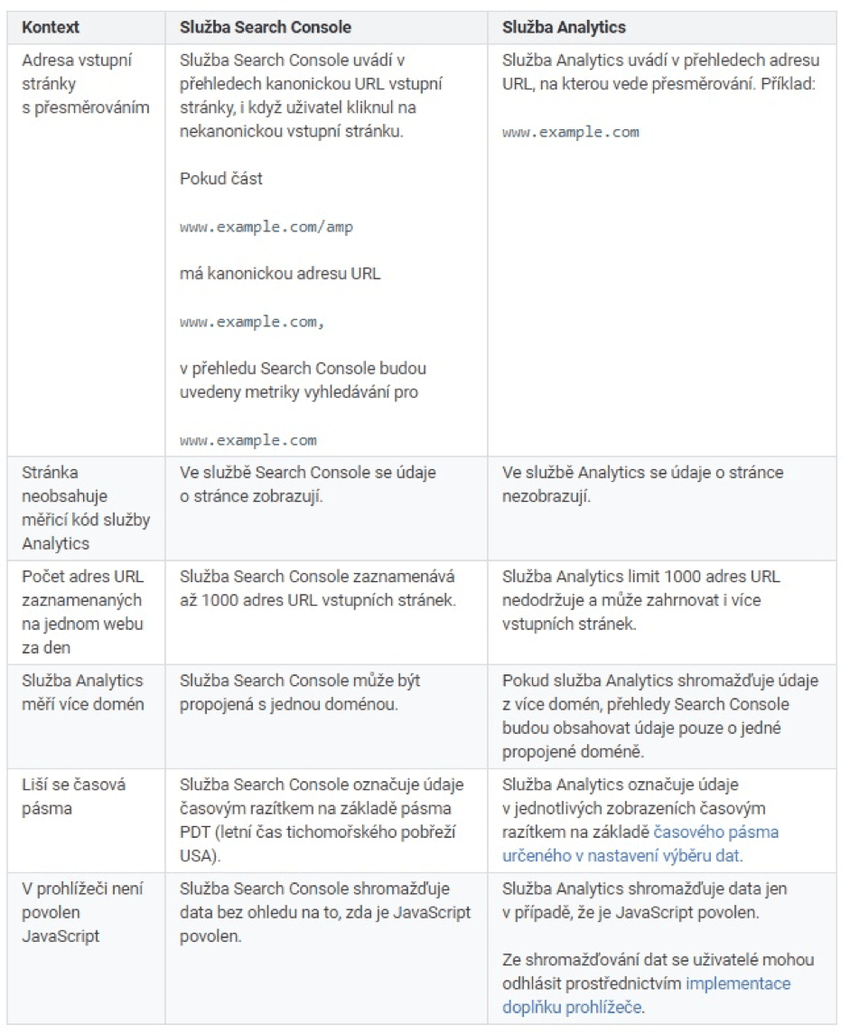 Nejprve je zapotřebí si říci, jaká data v GSC vidíme, abychom si mohli pokládat správné dotazy a data správně interpretovat. GSC poskytuje data pouze z organických výsledků vyhledávání. Častá otázka se týká porovnání Google Analytics (dále GA) a GSC a rozdílnosti dat. Tato data jsou rozdílná, protože každý nástroj funguje trochu jinak. Některé příklady naleznete v tabulce níže.