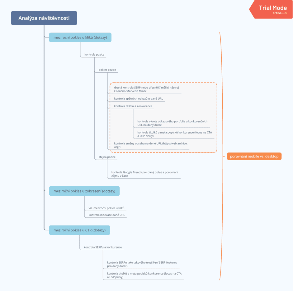 Nyní máme veškerá data jen ke konkrétní URL. Každý zde asi bude mít trochu jinou workflow. Samotný popis by asi stačil na samostatný článek. Sestavil jsem proto následující mindmapu, která ukazuje, jak k analýze přistupuji já.