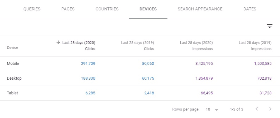 Jediné, co zde doplním, je, že nesmíte zapomenout na to, že obecně vám GSC ukazuje dohromady data pro mobile i desktop. Zde často naleznete určité rozdílnosti. V momentě, kdy srovnáváte data meziročně, tak si už podrobně nemůžete rozčlenit data na mobile vs. desktop. Základní overview uvidíte v dimenzi zařízení viz obrázek níže.