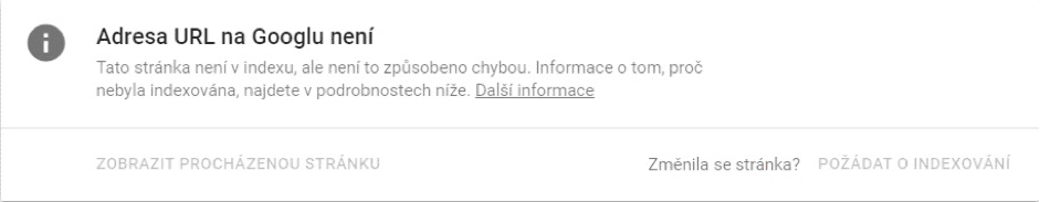 Problém se naskytne, pokud chcete, aby konkrétní URL byla indexována, ale není tomu tak a zobrazí se vám následující hláška. Tímto se vracíme ke zmíněným statusům a konkrétně statusu vyloučeno. V detailním přehledu zjistíte, jaký má status a proč daná URL není indexována.