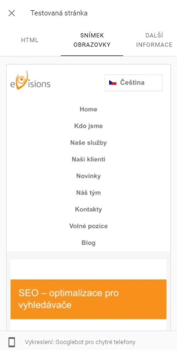 Zde může být první náznak problému, podívejte se na to, jak stránku vidíte vy jako uživatel, a porovnejte ji s tím, co vidí Googlebot. Zejména pokud na stránce využíváte některé prvky JavaScriptu. Další důležitá hint vás může čekat v záložce další informace, kde se můžete podívat na zdroje stránky, které se nepodařilo načíst. Nepodceňujte ani záložku HTML. Zejména pak v souvislosti s možnými problémy s canonical tagy a jejich ověřením např. v mobilní verzi webu.