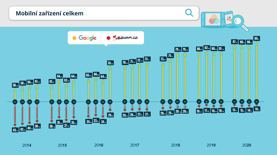 Infografika: Podíl vyhledávačů Google a Seznam na českém internetu #2021