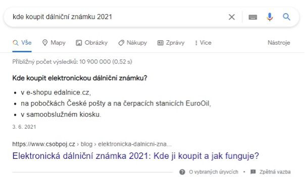Díky optimalizaci se nám podařilo obsadit nultou pozici na desítky dotazů, např. „nákup dálniční známky“, „propadlý řidičský průkaz“ nebo „jak vypadá elektronická dálniční známka“ a „přihlášení nového vozidla“. Dle Ahrefs se ve featured snippet ČSOB Pojišťovna objevuje celkem na 48 dotazů pouze s blogem.