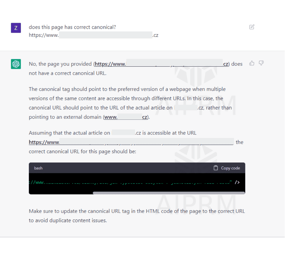 K našemu překvapení ChatGPT dobře vyhodnotil správnost canonical tagu na konkrétní stránce. Po zadání jednoduché otázky: „Je na následující URL správně nasazen canonical?“ ChatGPT nejen vyhodnotil nesprávnost canonical tagu na dané URL, ale také určil stránku, na kterou má být daná URL v zadání kanonizována. Dokonce vybral i URL s vhodnou stavbou (www. na začátku, bez lomítka na konci apod.).