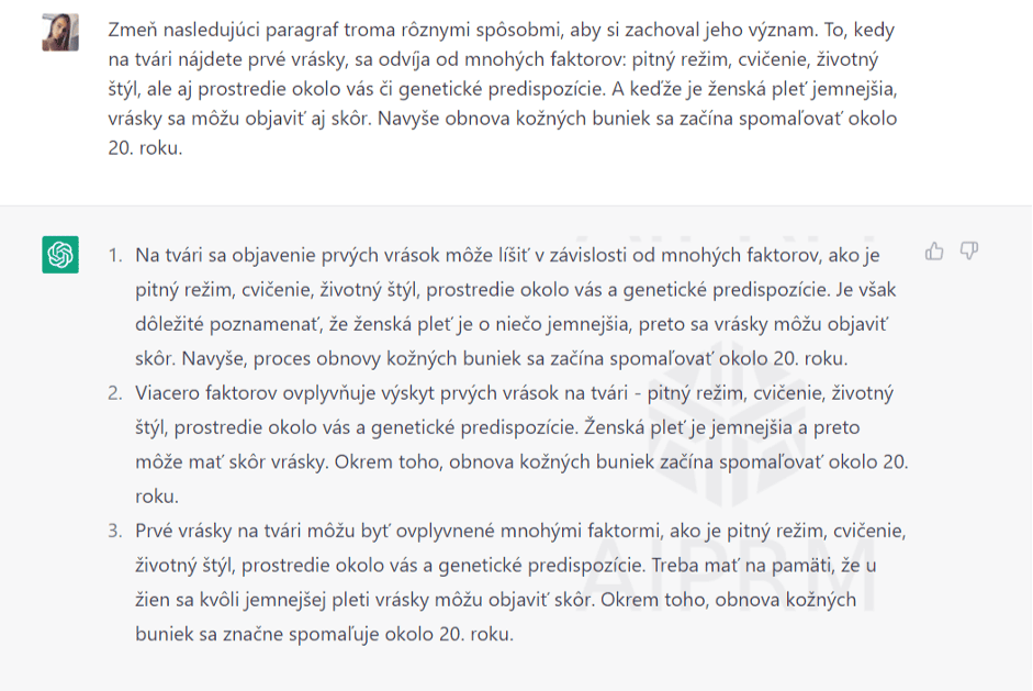 Zdravím Aleydu Solis, která použila toto zadání: „Rephrase following paragraph in 3 different ways to avoid repetition, while keeping it´s meaning.“ Tím získala hned 3 verze textu, u kterého se potřebovala vyhnout duplicitám na webu.