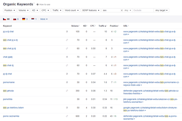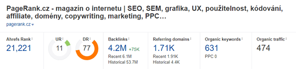 Velmi důležitý ukazatel, který by neměl být opomíjen. Říká, na jaká klíčová slova a na jakých pozicích se web umísťuje v organickém vyhledávání. Ukažme si význam této metriky například na doméně pagerank.cz. Na první pohled se zdá, že je to skvělý web, odkud určitě chceme odkaz získat. Vždyť domain rating dosahuje hodnoty 77 a referenčních domén má dokonce více než 1 700. To je skvělé, ne?