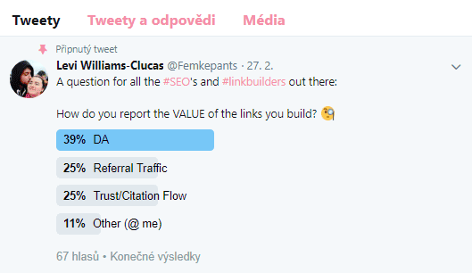 Z vlastní zkušenosti vím, že lidé stále nejvíc koukají na domain rating/domain autority (jen pro vysvětlení, rozdíl v těchto metrikách je nepatrný, jde v podstatě jen o název. Domain rating používá nástroj Ahrefs, domain authority Moz). Ostatně si k tomuto zjištění stačí pročíst pár diskuzí, článků nebo mrknout třeba na Twitter, kde proběhlo na konci února toto hlasování: