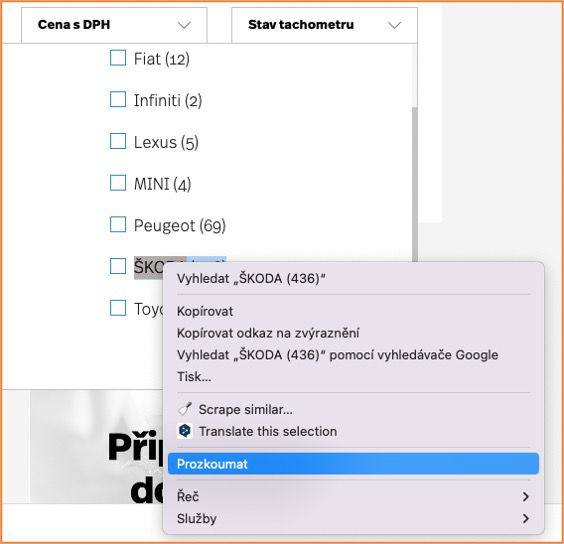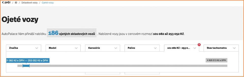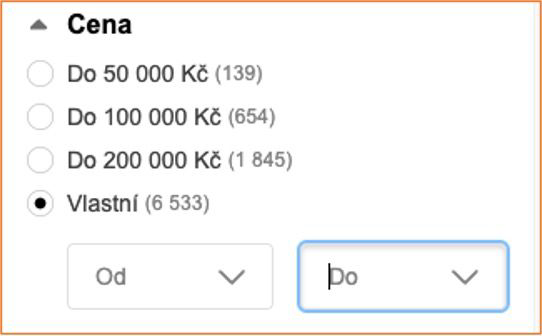Často nastává situace, kdy se hledají produktové dotazy v kombinaci s cenou, například „ojeté auto do 300 000“. Posuvníkový typ filtru můžeme obejít a vytvořit indexovatelný filtr v podobě proklikávacích políček.