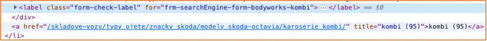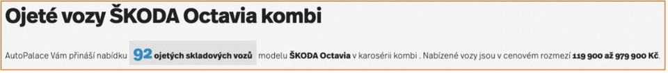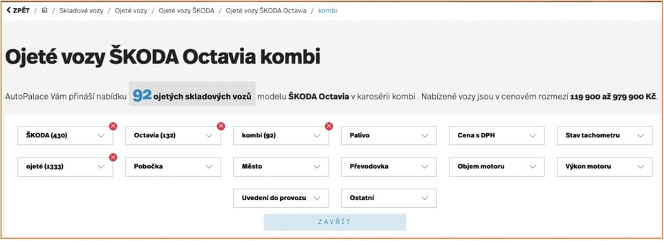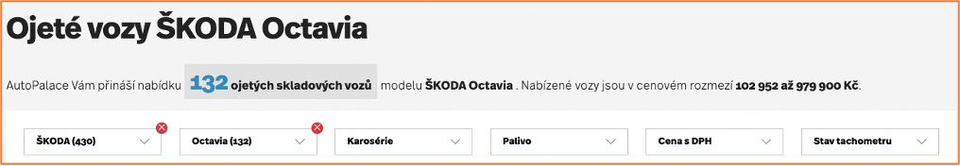 Zde nastává již jiná situace, protože analýza klíčových slov prozradila, které kombinace se napříč skupinami filtrů hledají. Zvolme příklad klíčového slova „ojeté vozy škoda octavia“, kde: