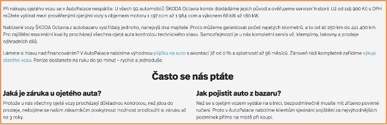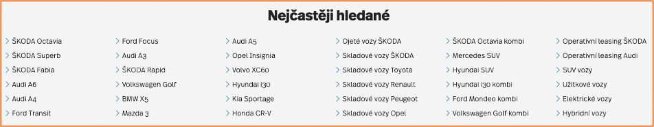 Parametrické stránky s největším potenciálem organické návštěvnosti je dobré podpořit i jinými odkazy v rámci webu. To i k usnadnění uživatelské orientace na webu. V rámci AutoPalace je řešeno způsobem přidání prolinkovací patičky s TOP hledanými dotazy: