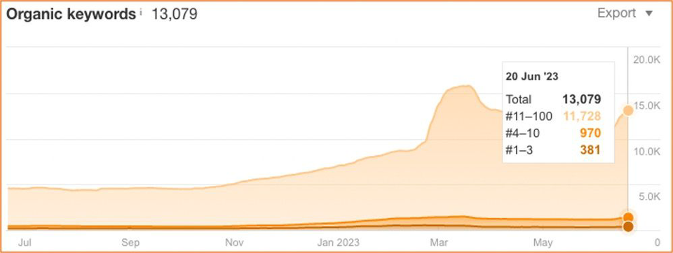 V meziročním porovnání za poslední 3 měsíce (březen – květen 2023) od půl roku aktivní spolupráce to v číslech znamená (toto období volím pro snadnější demonstraci výsledků na datech z GSC, která jsou omezena na horizontu 16 měsíců):
