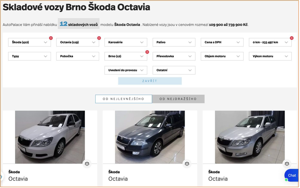 Žijeme v Česku, kde je nejhledanějším modelem automobilu Škoda Octavia. Po zadání dotazu do vyhledávače kliknete na první neplacený výsledek a navštívíte vstupní stránku. Právě na ní se nachází několik desítek až stovek inzerátů. Jak vybrat nabídku, která nejlépe splňuje vaše představy? Jdete do sekce filtrů a volíte požadavky – stav vozidla, rok výroby, palivo, karosérie a další nejrůznější specifikace. Čím více, tím lépe! V ideálním případě se bude na stránce nacházet už jen několik jednotek inzerátů. A ještě je srovnáte od nejlevnějšího podle ceny, protože proč platit zbytečně více.