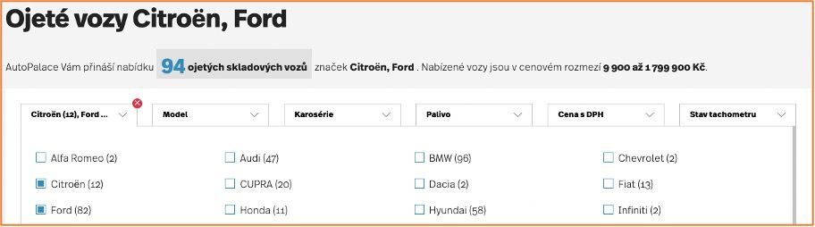 Bavíme se o případu kombinací dvou značek vozidel. Tyto kombinace ve vyhledávačích nejsou hledané, ale na webu je mít chceme. Například v sekci ojetých vozů, kde: