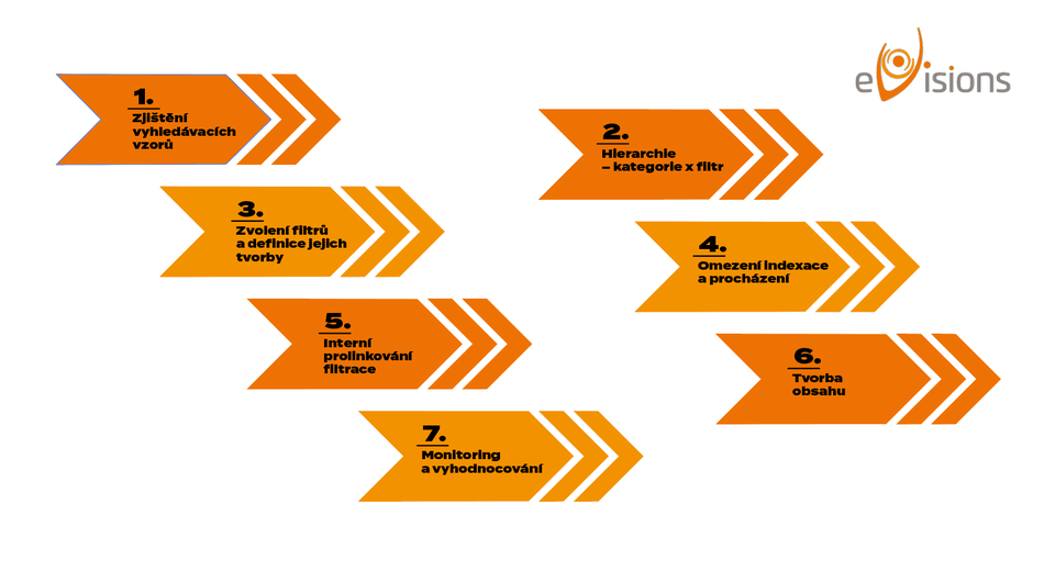 Teď již máme jasně vymezené vyhledávací vzory, které chceme filtrací pokrýt. Dále známe „best practise“, jaké kombinace filtrů a do jaké úrovně indexovat a nechat procházet roboty.