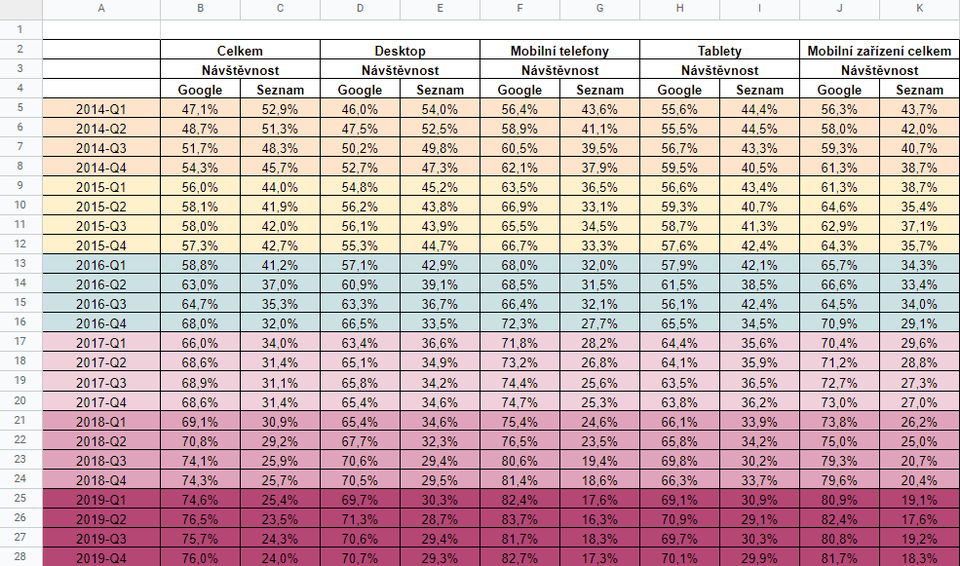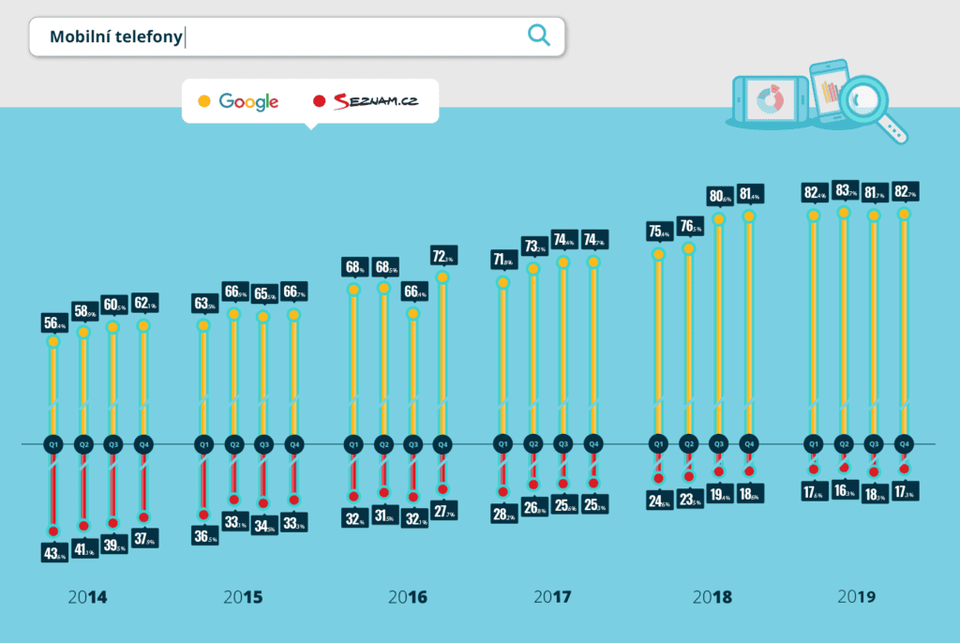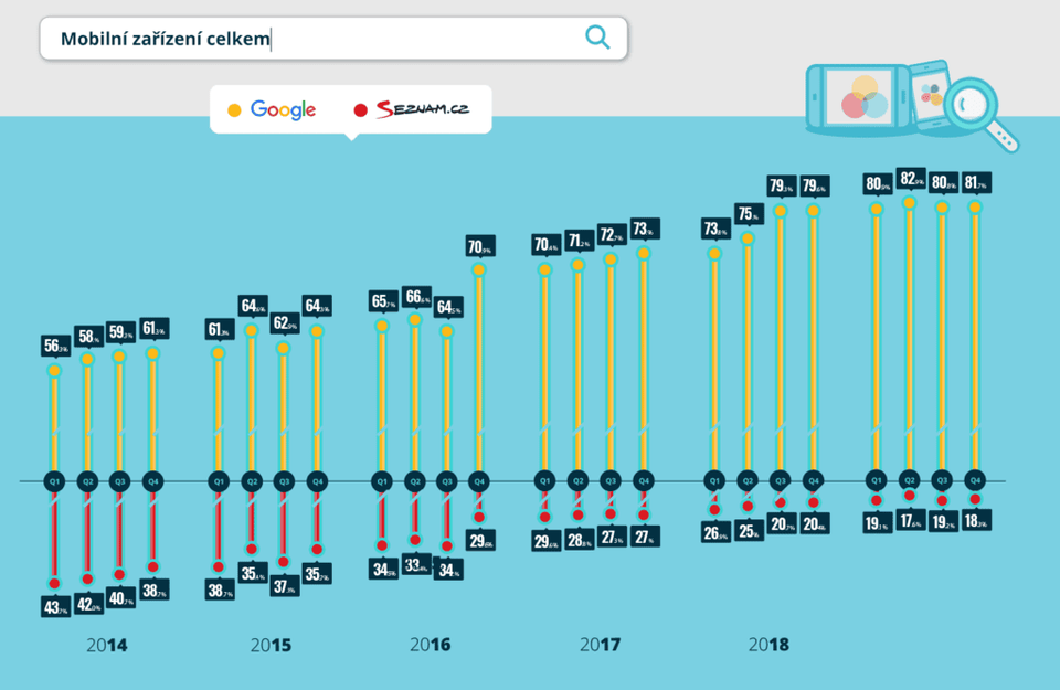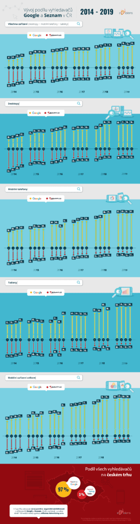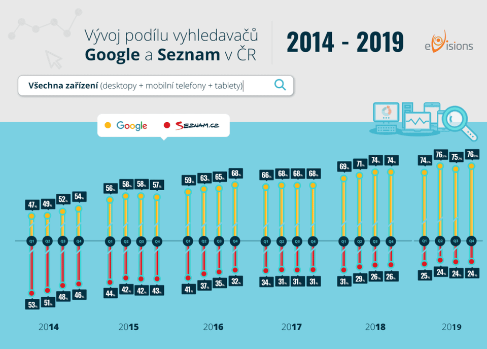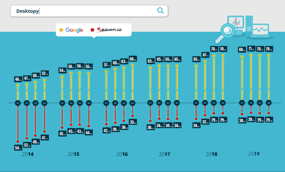 Od začátku roku 2014 do poloviny roku 2019 se poměr Google vs. Seznam otočil v desktopech ze 46 : 54 na 71 : 29. Google tedy narostl o 25 procentuálních bodů ze 46 % na 71 %, zatímco Seznam poměrně hodně ztrácel a klesl z 54 % na 29 %.