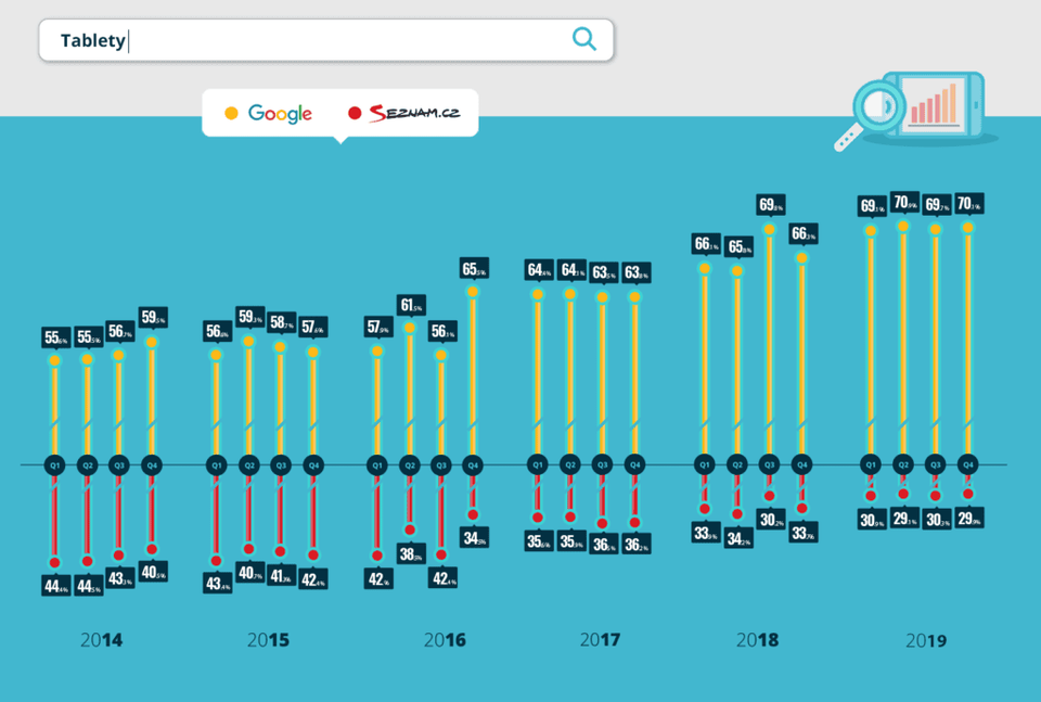 Návštěvnost z tabletů je oproti desktopům a mobilům zhruba 9–10× nižší. I zde však sledujeme, jak se situace mezi Googlem a Seznamem vyvíjí. Poměr mezi nimi byl na začátku sledovaného období 56 : 44 %. Na jeho konci roku 2019 je tento poměr 70 : 30 %.