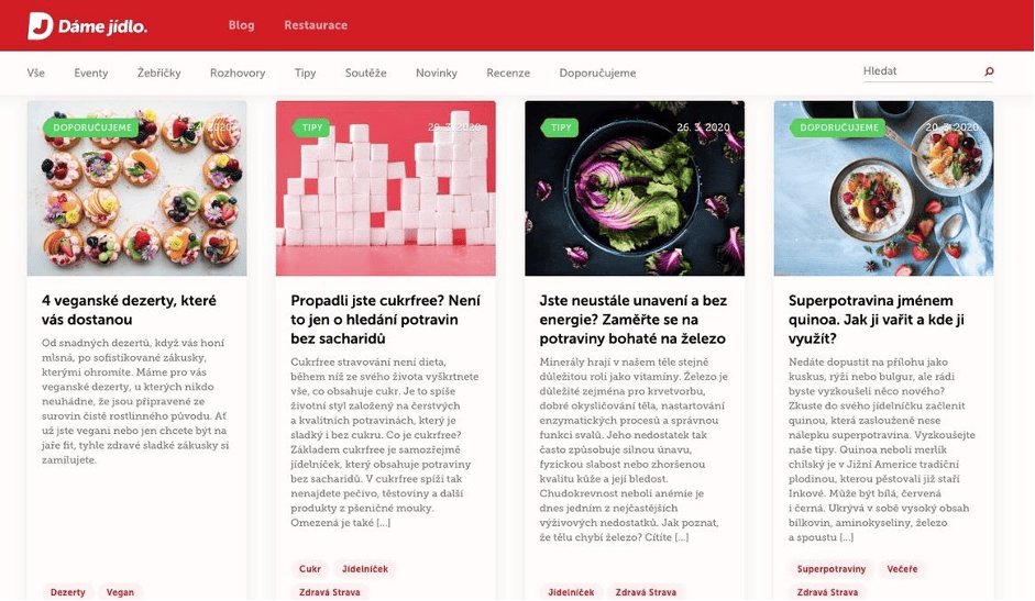 Velký SEO potenciál jsme viděli v rozšíření webu Dáme jídlo na komplexnějšího „průvodce“ ve food segmentu. Z vyhledávacích dotazů jsme usoudili, že v některých frázích panuje silný substituční efekt a záměr uživatelů se tak může snadno změnit pomocí obsahu.