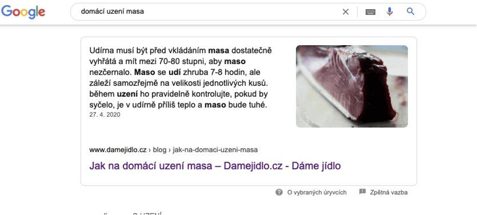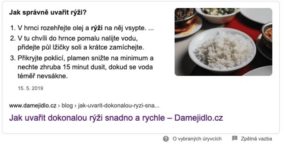 Kvalitní obsah ocenili čtenáři i vyhledávač Google. Detailně popsaný návod, jak uvařit rýži, posunul článek na nultou pozici a dostal ho do tzv. featured snippets. Výsledek ve featured snippets vás odliší od konkurence a zvýší povědomí o vaší značce.