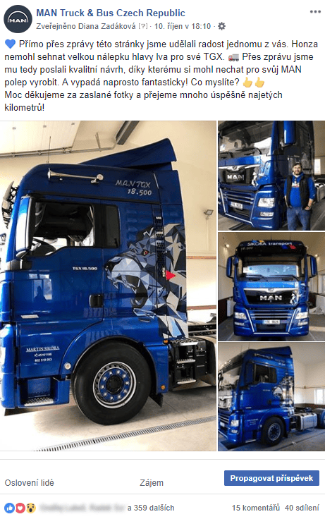 MAN Truck & Bus Czech Republic je však oficiální stránkou mezinárodně známého brandu, nikoliv FB skupinou bez regulovaného obsahu. A komunikace velkých značek na sociálních sítích má svá pravidla, která je nutné respektovat. A my jedině souhlasíme – kde jinde by fanoušci našli informace z nitra MANu, než na jejich oficiální stránce? Jak už víme, to, že na ně nereagují, ještě neznamená, že je nekonzumují. Zvláště naši brand profiteers je jistě ocení. 😊
