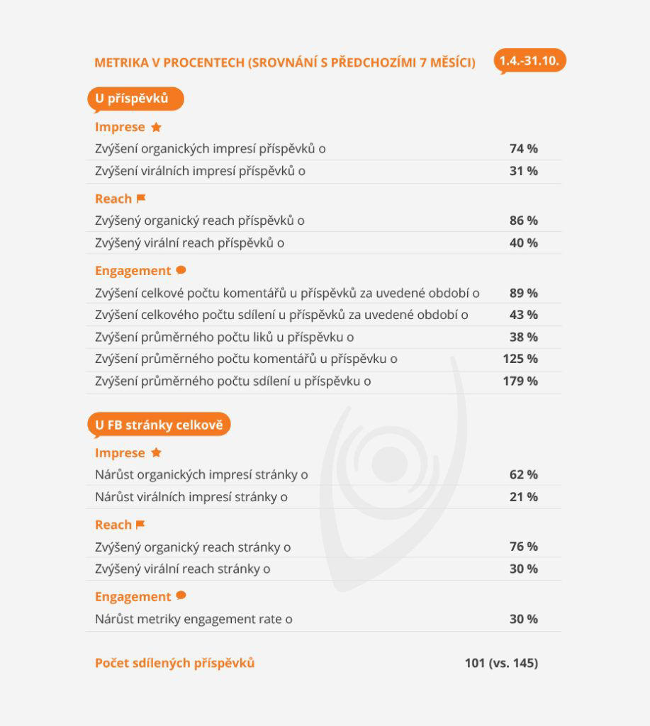 Zuckeberg dal jednoznačný recept na nový algoritmus, na kterém jsme postavili naši strategii. Ta nám v konečném důsledku přinesla dlouhodobý nárůst napříč všemi sledovanými organickými a virálními metrikami (engagement, reach, impressions).