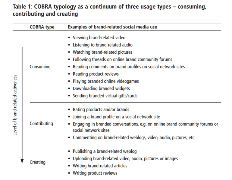 Tyto metriky se proto vyplatí vyhodnocovat separátně, jelikož jsou výsledkem různých druhů motivace k engagementu od mnohdy odlišných typů fanoušků. Tím se dostáváme ke koncepci COBRA (Consumer Online Brand-Related Activity).