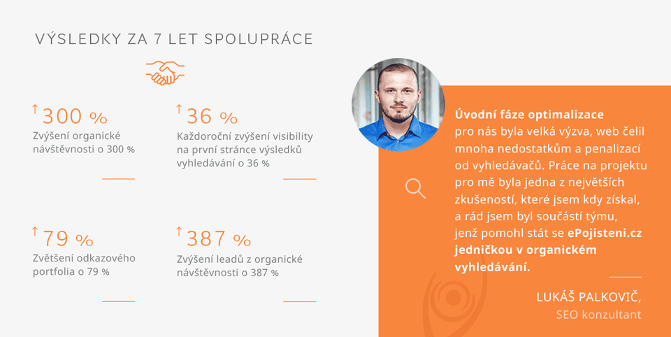 „Neuvěřitelný výkon a nasazení kluků a holek z eVisions nám už na počátku ukázal, že jsme si nemohli vybrat lépe. Jejich pozice expertů na SEO nám dodnes dokládají nejen skvělé výsledky návštěvnosti z organického vyhledávání, ale také chvála, kterou na tým Lukáše Palkoviče slyšíme od lidí z oboru. Za ty roky je bereme jako součást našeho vlastního týmu. I proto jim svěřujeme náš nový projekt Srovnejto.cz, který bude o dost větší výzvou než ePojisteni.cz.“