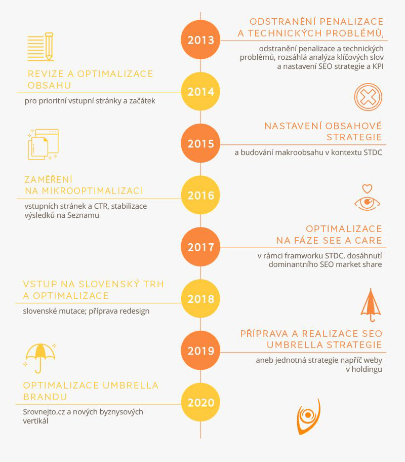 Akvizice dalšího webu měla velmi vysoký dopad na fungování SEO a na přelomu let 2018/2019 jsme začali pracovat s tzv. umbrella strategií, která měla za cíl multiplikovat viditelnost klienta v organickém vyhledávání a sjednotit komunikaci pod jednu značku. Díky tomu došlo k propojení a rozšíření dalších byznysových vertikál, a to jak v rámci pojištění a kalkulaček, tak u mobilních tarifů, slevových portálů, porovnávačů energií a půjček. Pozitivní byly i dopady po stránce brand awareness.