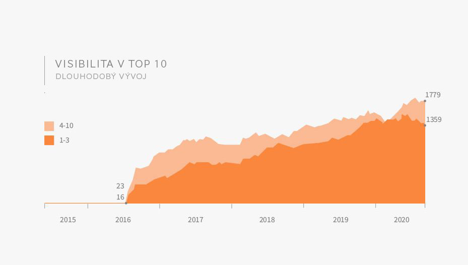 Průměrný meziroční nárůst viditelnosti na pozicích v TOP 3 o 18 % a v TOP 10 o 36 %
