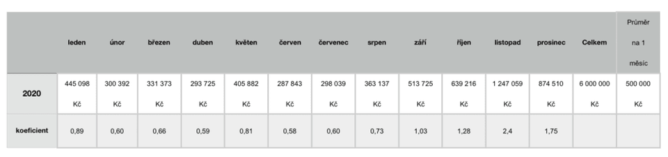 Výpočet koeficientu je velmi jednoduchý. Do tabulky si vložíme obrat firmy v jednotlivých měsících. Spočítáme průměrný obrat na jeden měsíc (celkový obrat / 12) a následně vydělíme obrat v daném měsíci průměrnou hodnotou (př. leden = 350 000 / 375 000). Takto pokračujeme pro všechny měsíce. Abychom získali finální koeficient pro jednotlivé měsíce, jednoduše jej zprůměrujeme.