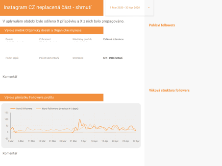 V případě, kdy má klient Instagram a my ho spravujeme, samozřejmě reportujeme výsledky i z této sociální sítě. Klasicky reportování instagramového účtu rozdělujeme do dvou částí – na organickou a placenou.