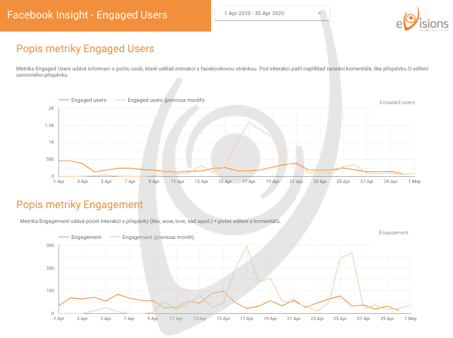 Další část organické části reportu je věnována grafům znázorňujícím vývoj metrik engaged users a engagement. Zde je vhodné zdůraznit, že nástroj, který jsme pro reportování používali dříve, počítal engagement jako sumu likes (haha, love apod.), komentářů a sdílení. Pro zachování konzistentnosti dat jsme pokračovali v počítání této metriky stejným způsobem.