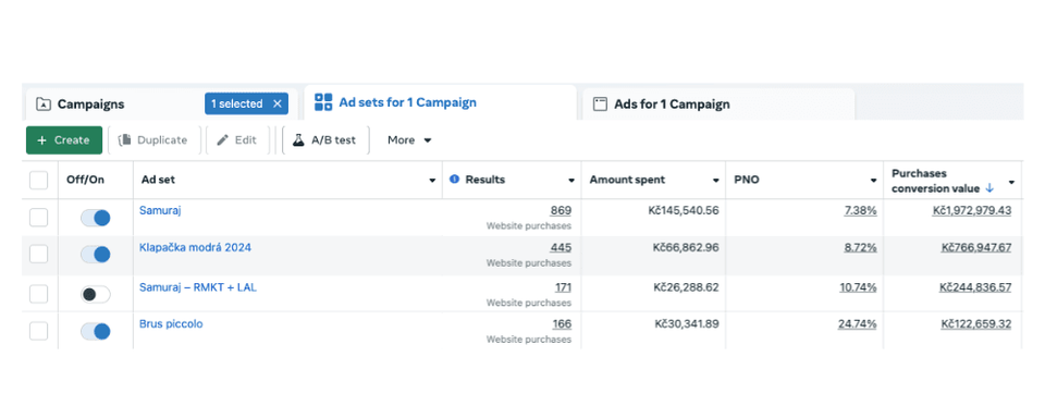 Počáteční výsledky na Facebooku byly spíše demotivující. Nízký počet konverzí, PNO 149 % a vysoké náklady na získání zákazníka nás přiměly zamyslet se nad dalšími kroky.