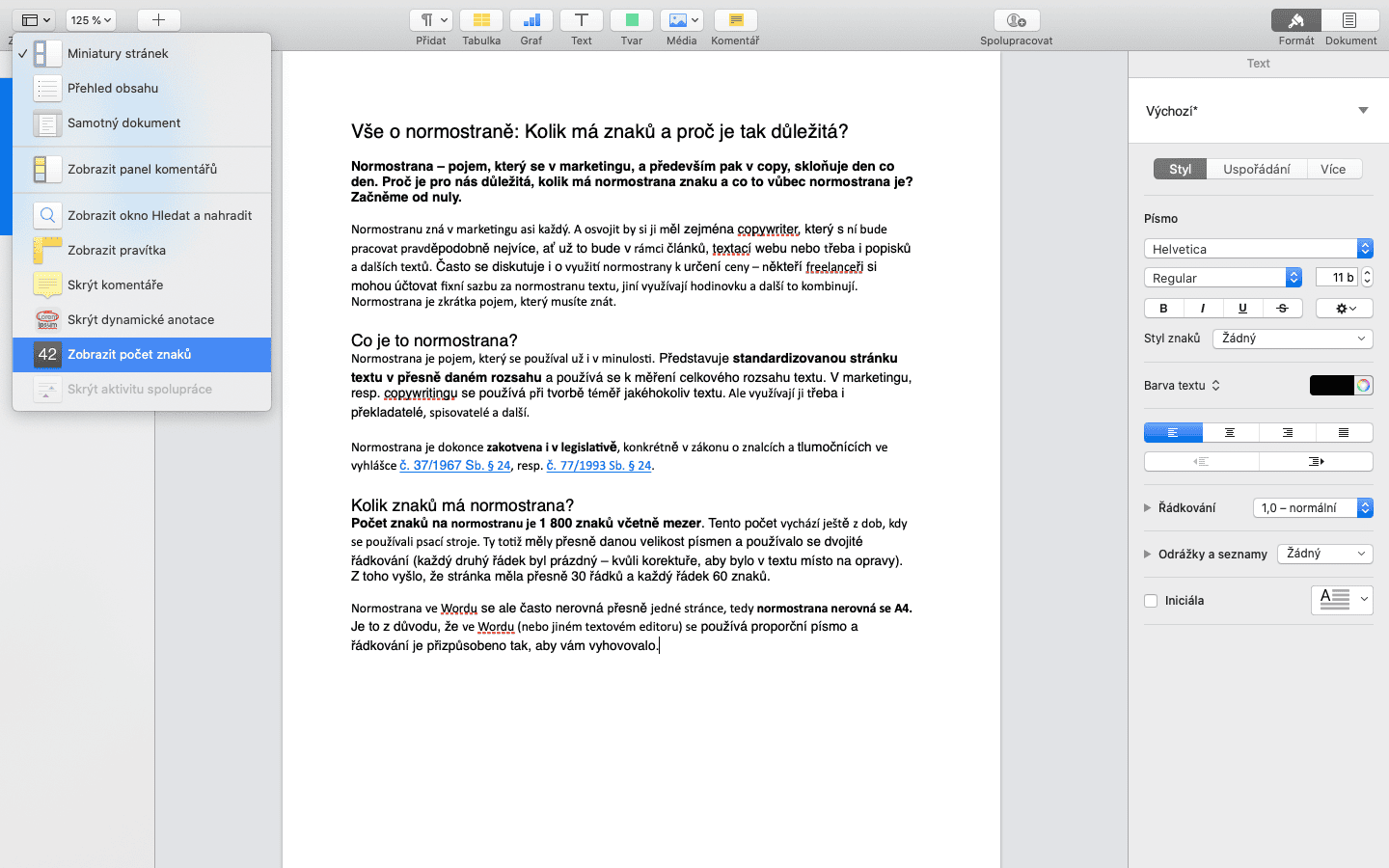 V Pages najdete počet znaků, když vlevo nahoře **kliknete na „Zobrazení“ a vyberete možnost „Počet slov“.**V dokumentu se vám pak dole uprostřed zobrazí pole s počtem slov, kde stačí vybrat „Počet znaků s mezerami“. Osobně považuju tohle řešení za elegantnější, protože máte čísla vždy na očích a nemusíte už nikam klikat. Ale my, co používáme Word, si to holt vyklikáme. 🙂