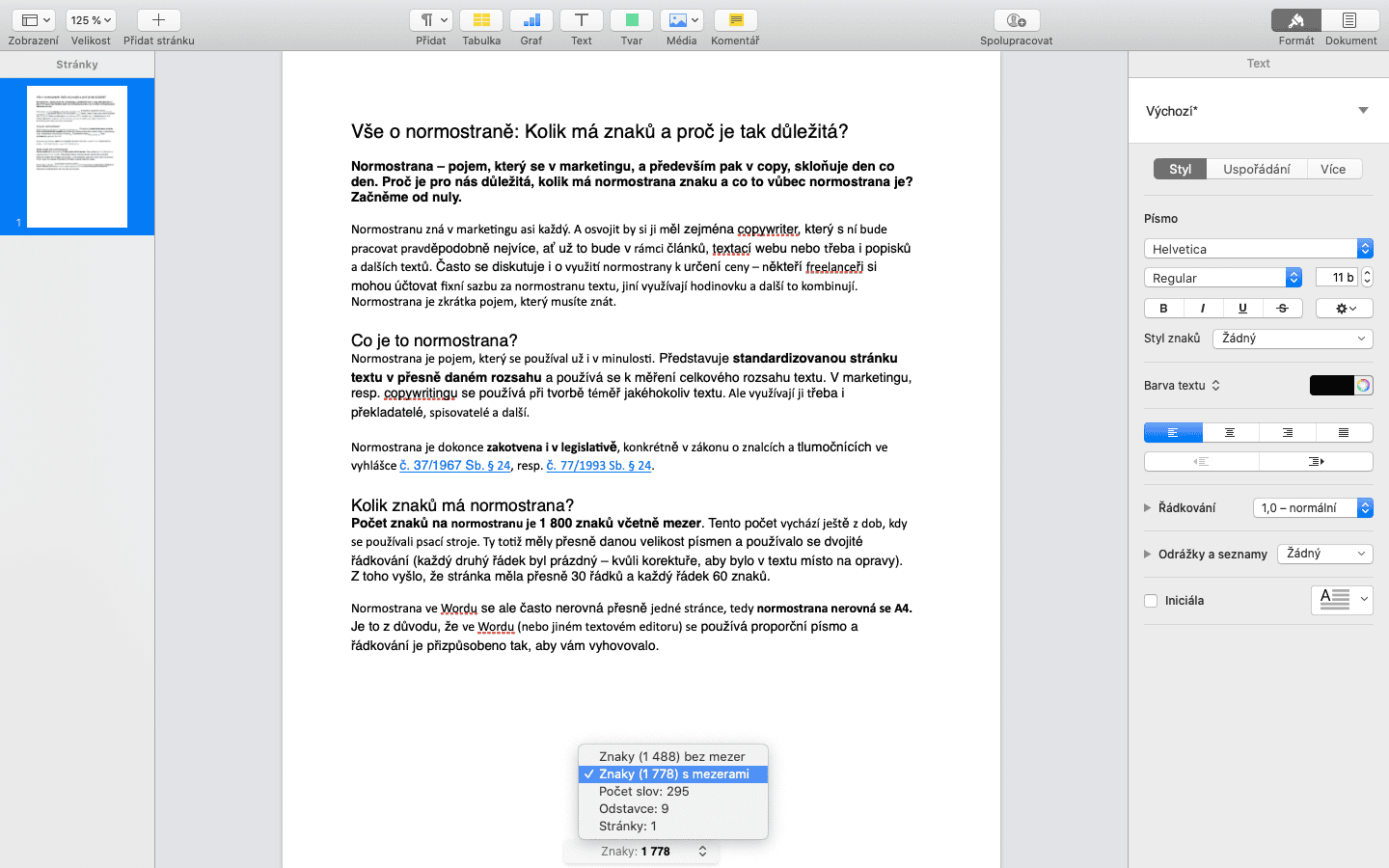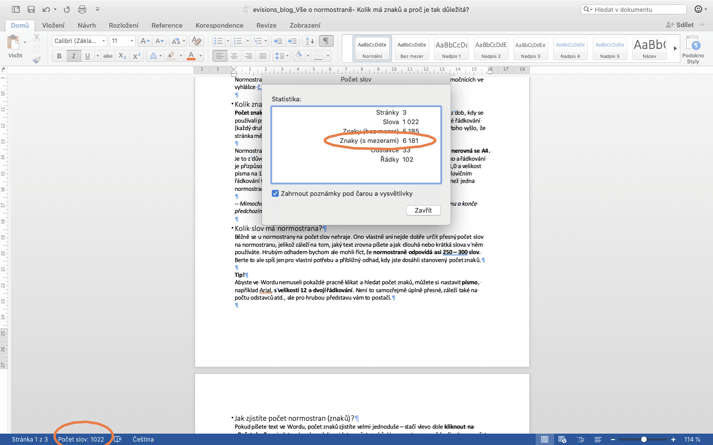 Pokud píšete text ve Wordu, počet znaků zjistíte velmi jednoduše – stačí vlevo dole kliknout na „Počet slov“ a vyjedete vám okno, kde najdete počet znaků. U normostrany se vždy dívejte na počet znaků s mezerami. Maličko víc kliků uděláte, když okno s počtem znaků otevřete přes „Revize“ a následně „Počet slov“.