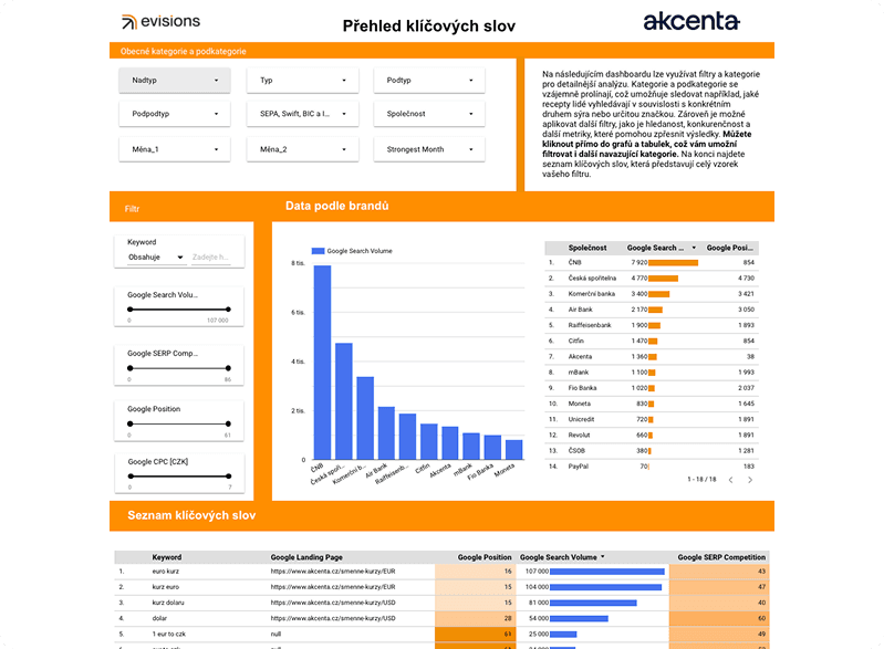 Z nepřehledných tabulek jsme vytvořili interaktivní dashboard v Lookeru, který umožňuje filtrovat a porovnávat výkonnost klíčových slov napříč značkami i kategoriemi. Díky vizuálním grafům a pokročilé filtraci má tým Akcenty okamžitý přehled o prioritách a potenciálu dalšího růstu.