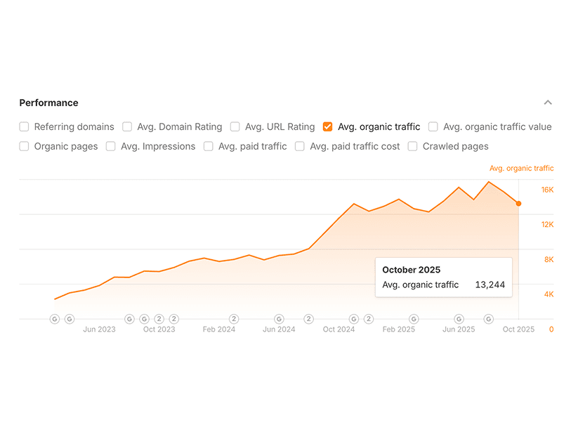 Veřejná data z Ahrefsu ukazují výrazný nárůst organické návštěvnosti z 2 265 na 13 244 měsíčně. Výsledky potvrzují efektivitu SEO aktivit a dlouhodobý růst viditelnosti webu.