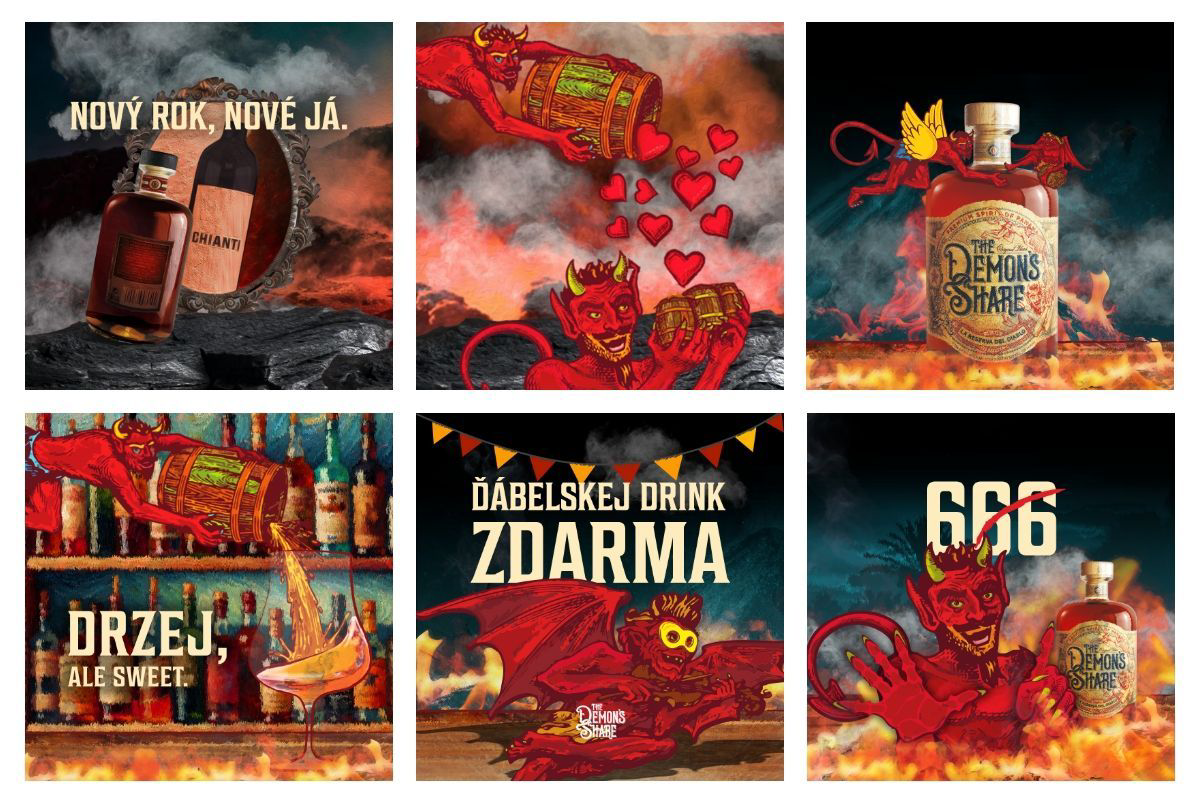 Ukázka online bannerů vytvořených podle výrazné ďábelské vizuální identity značky Demon’s Share. Kreativní koncept staví na odvážném tónu komunikace a poutavých ilustracích, které přitahují pozornost cílové skupiny.